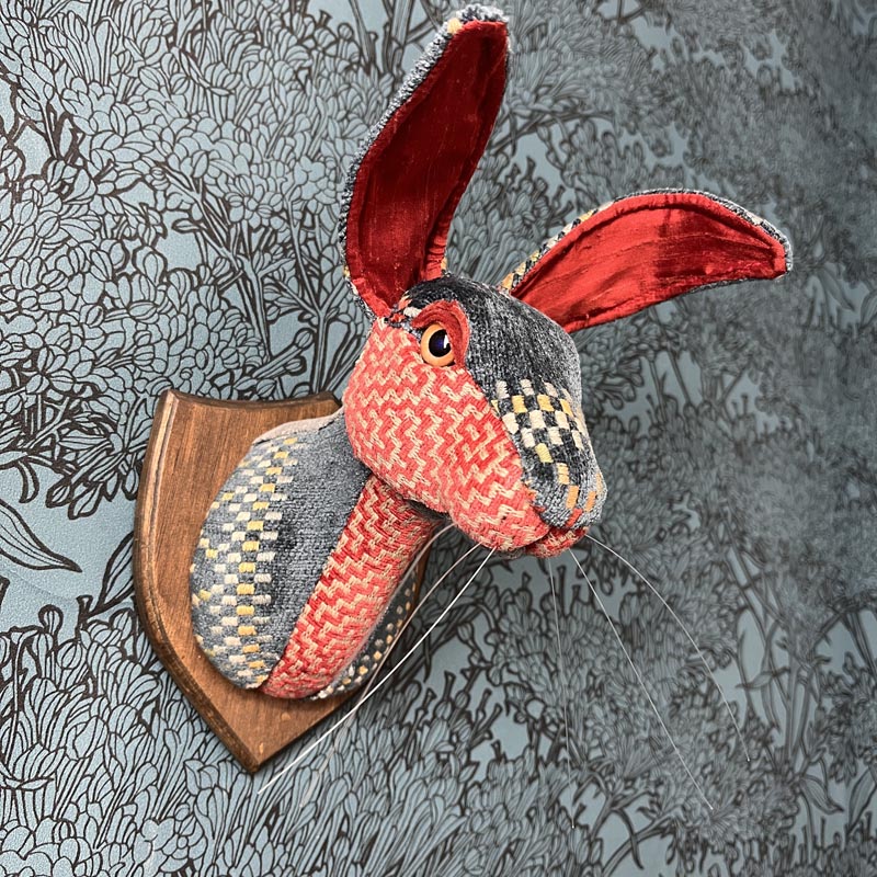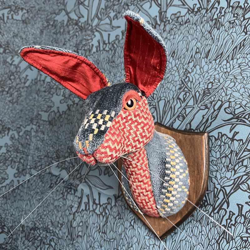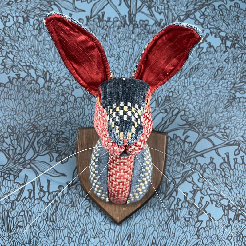 Zumo is an ethnic patterned hare. Her fabrics are a woven pattern with an geometric ethnic design that is reminiscent of a South American style, alongside a red and cream herringbone woven fabric and a blue chenille. Her eyes are resin, and her plaque is made from wood and stained a mid brown. Her poseable ears have slubbed dupion silk liners.
